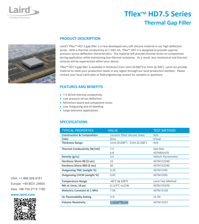 Tflex HD7.5 Silicone Based Thermal Gap Filler Thermal Pad Laird Thermal Conductivity 7.5W/Mk Grey High Deflection